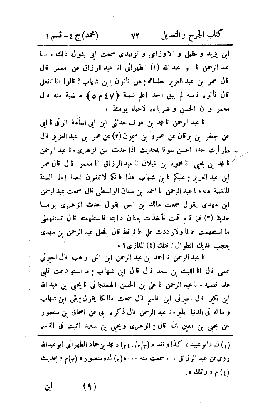 حَدثنا عَبد الرَّحمن، حَدثنا أَحمد بن سنان الواسطي، قال: سَمِعتُ عَبد الرَّحمن بن مهدي يقول: سَمِعتُ مالك بن أَنس يقول: حدث الزُّهْري يوما حديثا، فلمَّا قام قمت فأخذت بعنان دابته، فاستفهمته، قال: تستفهمني، ما استفهمت عالما ولا رددت على عالم قط، قال: فجعل عَبد الرَّحمن بن مهدي يعجب، فذيك الطوال؟ فتلك المغازي ؟.