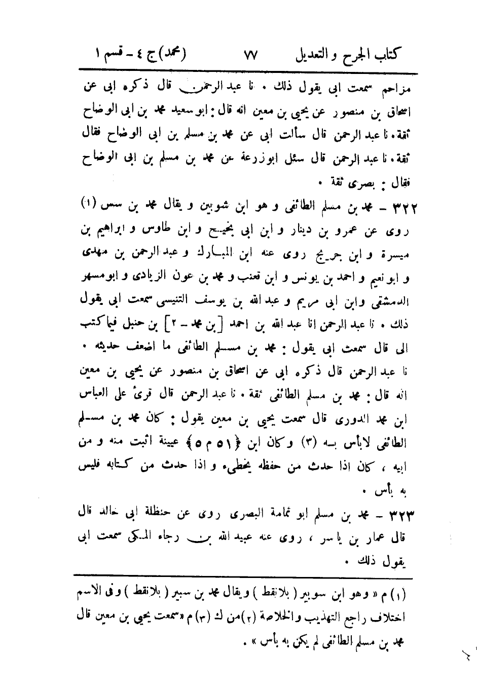 حَدثنا عَبد الرَّحمن، قال: قُرِئَ عَلَى العباس بن محمد الدُّوري، قال: سَمِعتُ يَحيَى بن مَعين يقول: كان محمد بن مسلم الطائفي لا بأْس به، وكان ابن عُيَينة أثبت منه ومن أَبيه، كان إذا حدث من حفظه يخطئ، وإذا حدث من كتابه فليس به بأسٌ.