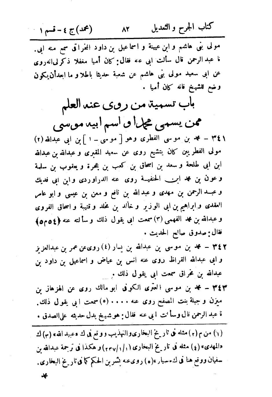 - باب تسمية من رُوي عنه العلم، مِمَّن يُسَمَّى مُحَمدًا، واسم أَبيه موسى.