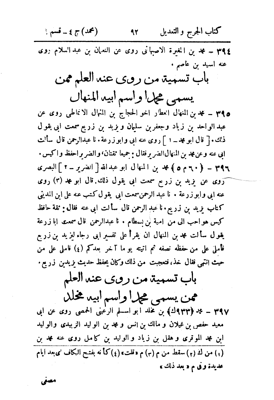 - باب تسمية من رُوي عنه العلم، مِمَّن يُسَمَّى مُحَمدًا، واسم أَبيه المنهال.