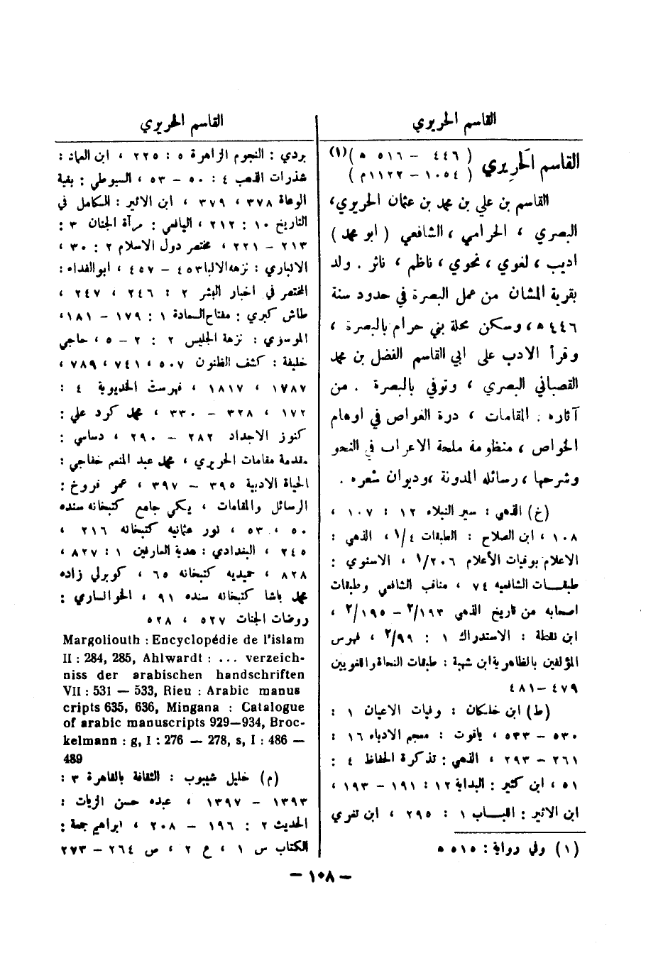 172، 328 - 330، محمد كرد علي: كنوز الاجداد 282 - 290، دساسي: مقدمة مقامات الحريري، محمد عبد المنعم خفاجي: الحياة الادبية 395 - 397، عمر فروخ: الرسائل والمقامات، يكي جامع كتبخانه سنده 50، 53، نور عثمانيه كتبخانه 216، 245، البغدادي: هدية العارفين 1: 827، 828، حميديه كتبخانه 65، كوبرلي زاده محمد باشا كتبخانه سنده 91، الخوانساري: روضات الجنات 527، 528 Margoliouth: Encyclopedie de l ' islam - II: 482 , 582 , Ahlwardt:..verzeich niss der arabischen handschriften VII: 135 - 335 , Rieu: Arabic manus cripts 536 , 636 , Mingana: Catalogue - of arabic manuscripts 929 - 439 , Broc - 486: kelmann: g , I: 672 - 872 , s , I.