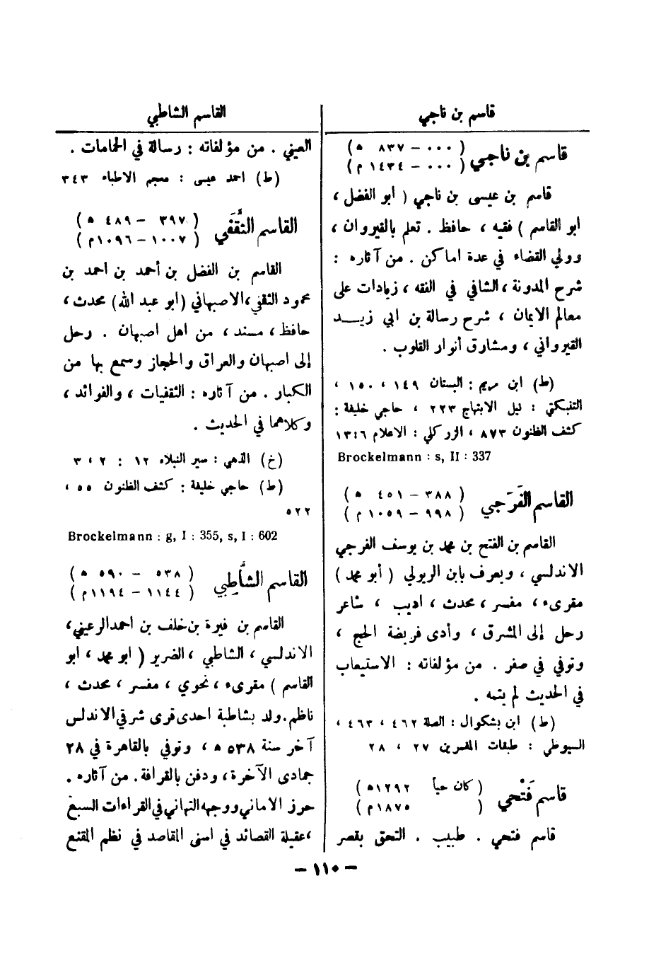 602: Brockelmann: g , I: 553 , s , I القاسم الشاطبي (538 - 590 هـ) (1144 - 1194 م) القاسم بن فيرة بن خلف بن احمد الرعيني، الاندلسي، الشاطبي، الضرير (أبو محمد، أبو القاسم) مقرئ، نحوي، مفسر، محدث، ناظم.
