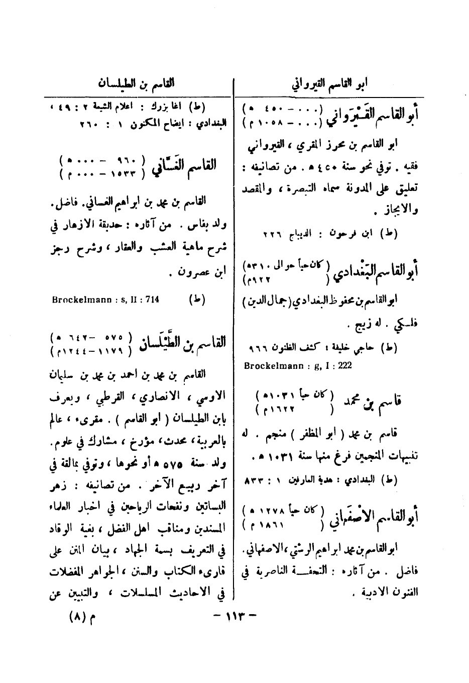 (ط) ابن فرحون: الديباج 226 أبو القاسم البغدادي (كان حيا حوالى 310 هـ) (922 م) أبو القاسم بن محفوظ البغدادي (جمال الدين) فلكي.