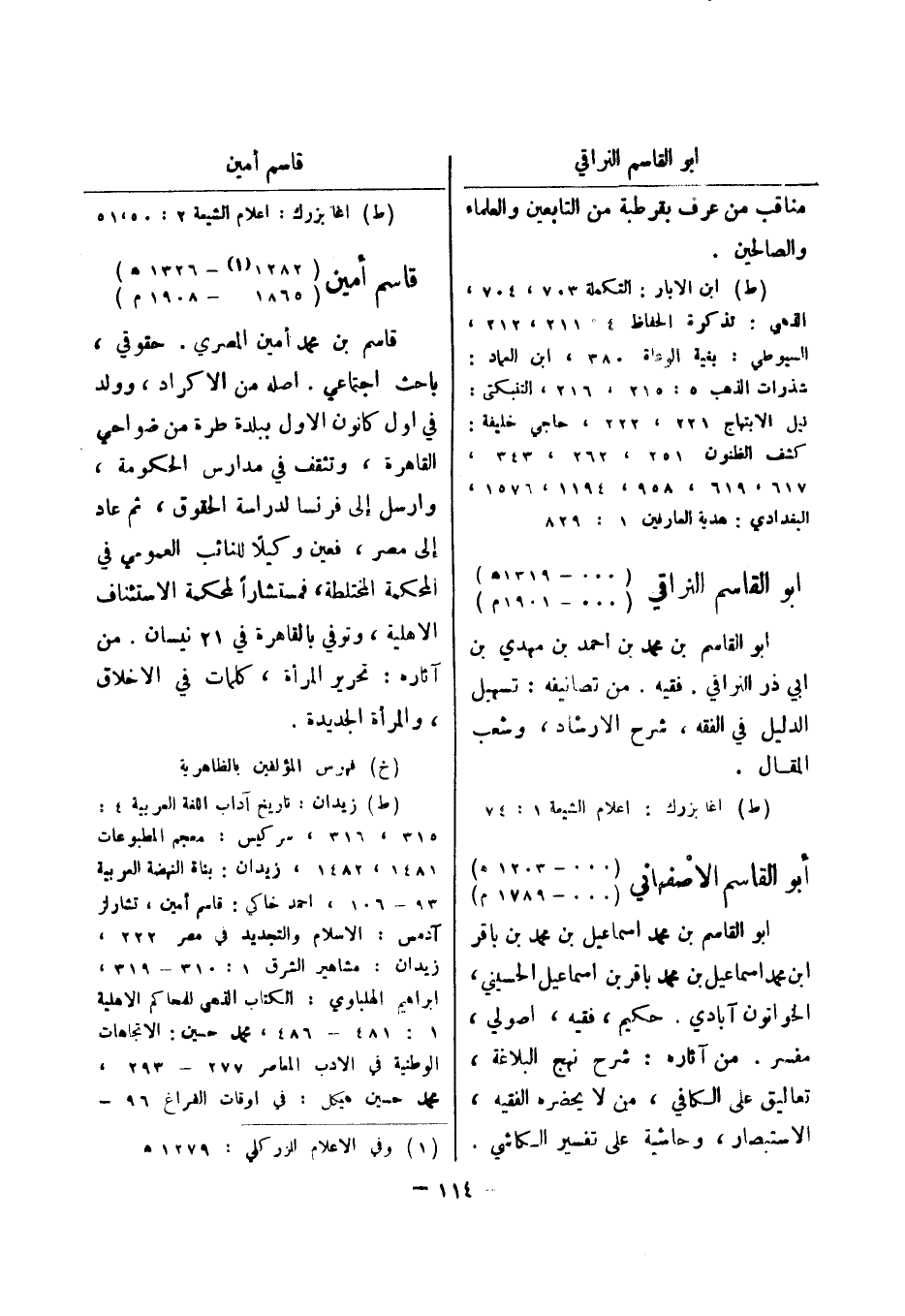 (ط) اغا بزرك: اعلام الشيعة 2: 50، 51 قاسم أمين (1282 (1) - 1326 هـ) (1865 - 1908 م) قاسم بن محمد أمين المصري.