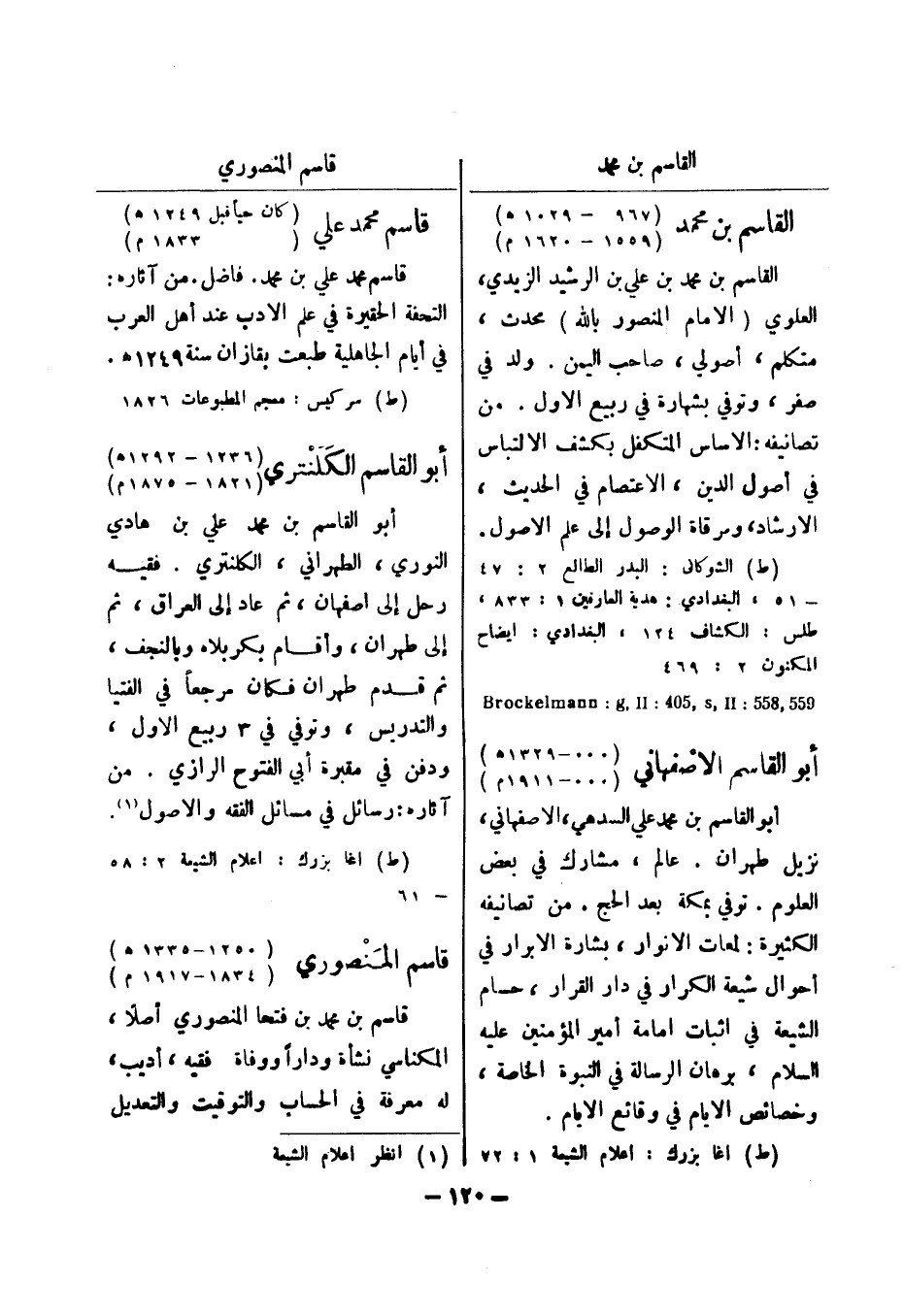 - 51، البغدادي: هدية العارفين 1: 833، طلس: الكشاف 124، البغدادي: ايضاح المكنون 2: 469 559 , 558: Brockelmann: g , II: 504 , s , II أبو القاسم الاصفهاني (..- 1329 هـ) (..- 1911 م) أبو القاسم بن محمد علي السدهي، الاصفهاني، نزيل طهران.