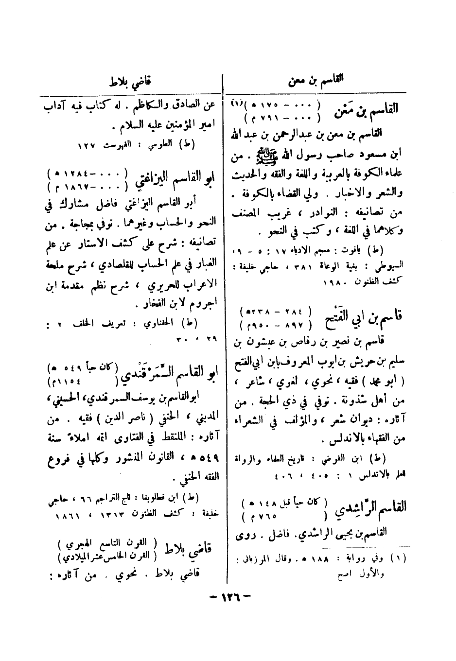 (ط) ابن الفرضي: تاريخ العلماء والرواة للعلم بالاندلس 1: 405، 406 القاسم الراشدي (كان حيا قبل 148 هـ) (765 م) القاسم بن يحيى الراشدي.