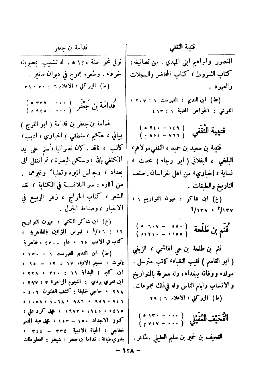 (ط) الزر كلي: الاعلام 6: 30، 31 قدامة بن جعفر (..- 337 هـ) (..- 948 م) قدامة بن جعفر بن قدامة (أبو الفرج) بياني، حكيم، منطقي، اخباري، اديب، كاتب، ناقد.