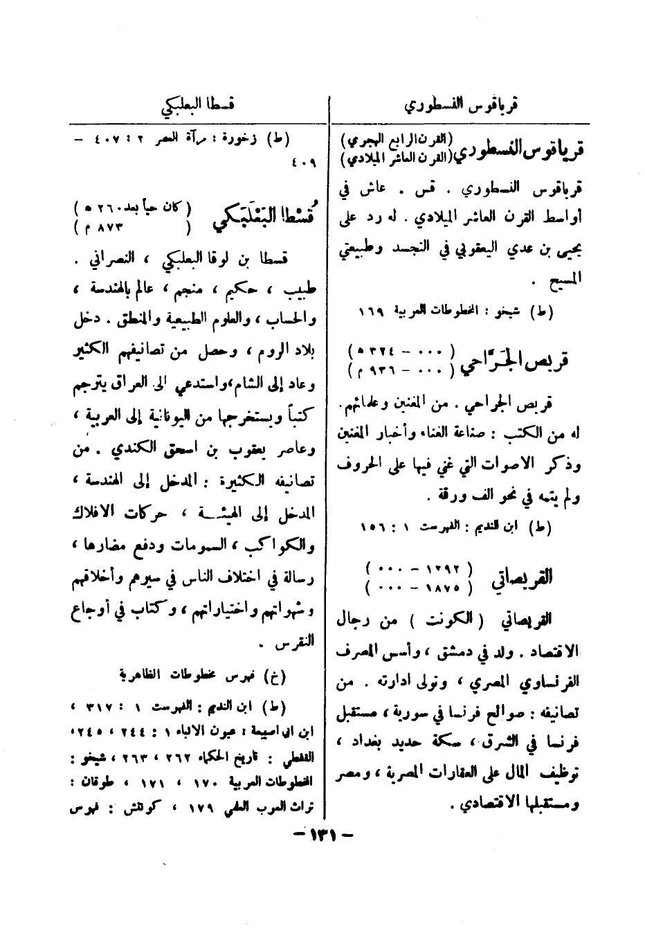 (ط) ابن النديم: الفهرست 1: 156 القربصاتي (1292 -..) (1875 -..م) القربصاني (الكونت) من رجال الاقتصاد.