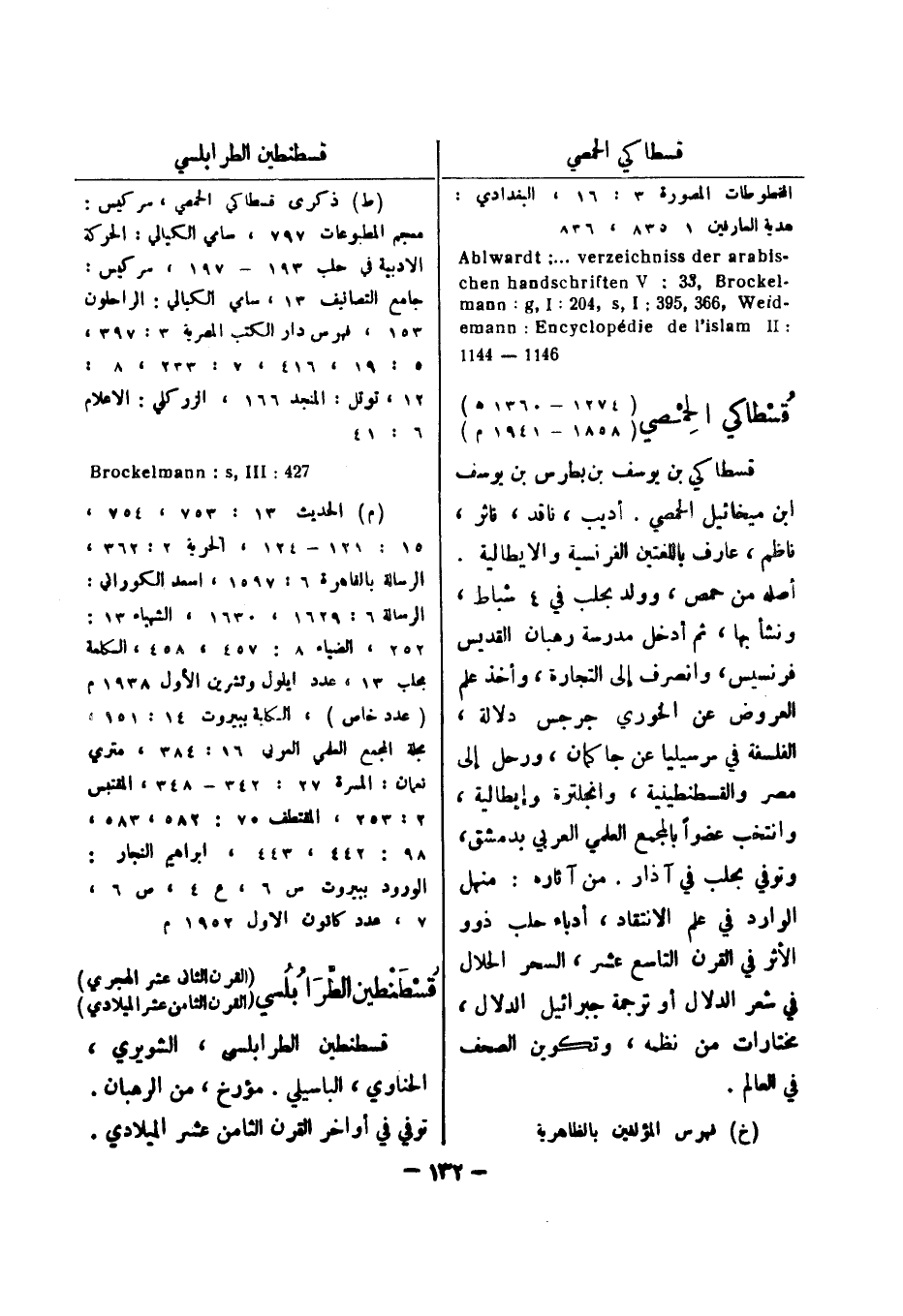 المخطوطات المصورة 3: 16، البغدادي: هدية العارفين 1: 835، 836 - Ahlwardt:..verzeichniss der arabis - chen handschriften V: 33 , Brockel - mann: g , I: 402 , s , I: 593 , 663 , Weid: emann: Encyclopedie de l ' islam II 1146 - 1144 قسطاكي الحمصي (1274 - 1360 هـ) (1858 - 1941 م) قسطاكي بن يوسف بن بطرس بن يوسف ابن ميخائيل الحمصي.