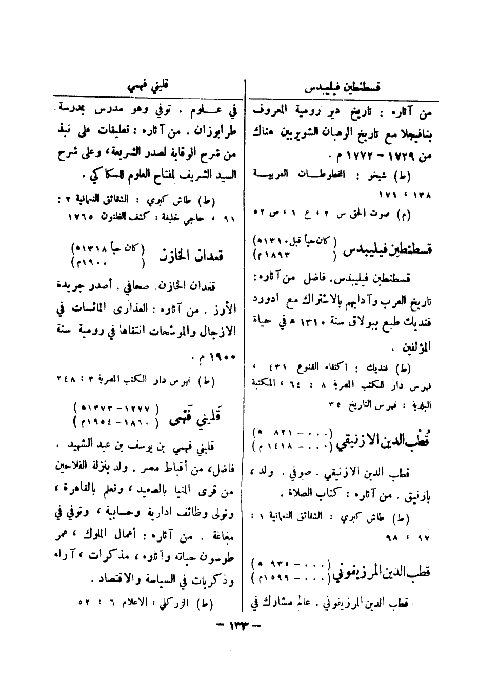 (ط) فنديك: اكتفاء القنوع 431، فهرس دار الكتب المصرية 8: 64، المكتبة البلدية: فهرس التاريخ 35 قطب الدين الازنيقي (..- 821 هـ) (..- 1418 م) قطب الدين الازنيقي.