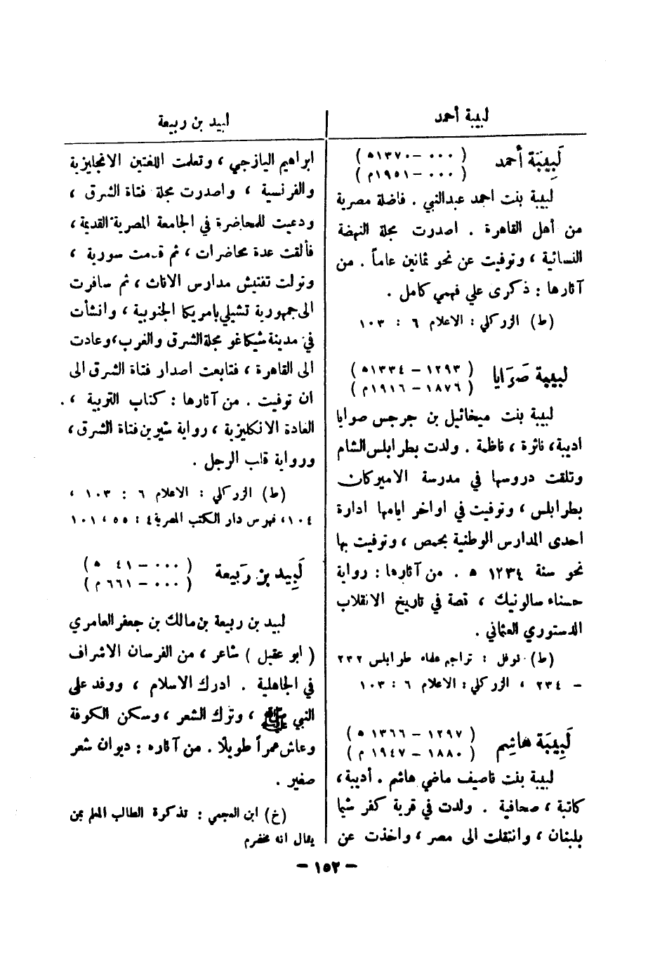 (ط) الزر كلي: الاعلام 6: 103 لبيبة صوايا (1293 - 1334 م) (1876 - 1916 م) لبيبة بنت ميخائيل بن جرجس صوايا اديبة، ناثرة، ناظمة.