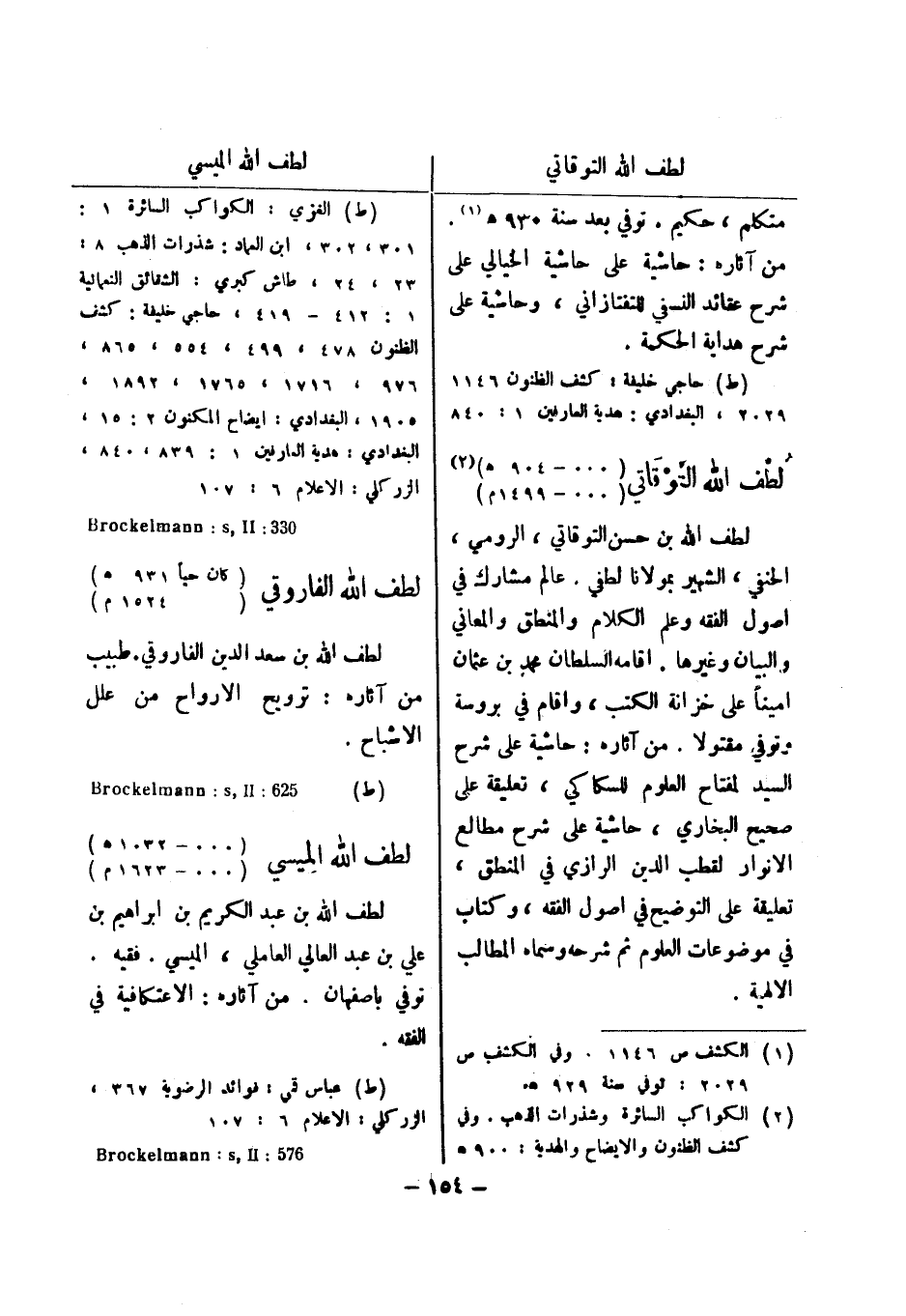 (ط) الغزي: الكواكب السائرة 1: 301، 302، ابن العماد: شذرات الذهب 8: 23، 24، طاش كبري: الشقائق النعمانية 1: 412 - 419، حاجي خليفة: كشف الظنون 478، 499، 554، 865، 976، 1716، 1765، 1892، 1905، البغدادي: ايضاح المكنون 2: 15، البغدادي: هدية العارفين 1: 839، 840، الزر كلي: الاعلام 6: 107 330: Brockelmann: s , II لطف الله الفاروقي (كان حيا 931 هـ) (1524 م) لطف الله بن سعد الدين الفاروقي.
