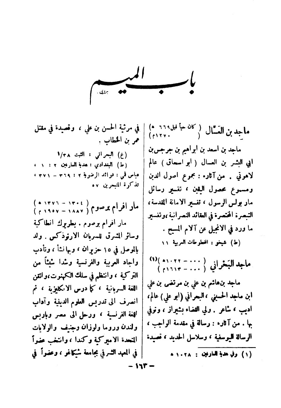 (ط) شيخو: المخطوطات العربية 11 ماجد البحراني (..- 1022 هـ) (1) (..- 1163 م) ماجد بن هاشم بن علي بن مرتضى بن علي ابن ماجد الحسيني، البحراني (أبو علي) عالم، اديب، شاعر.