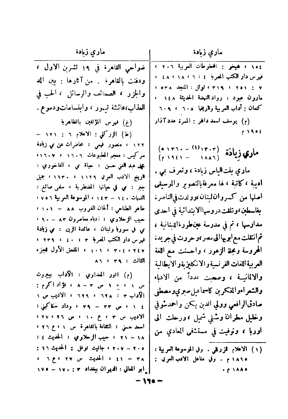 154، شيخو: المخطوطات العربية 206، فهرس دار الكتب المصرية 4: 6، 18، 48، 7: 251، 319، توتل: المنجد 538، مارون عبود: رواد النهضة الحديثة 148، كنعان: آداب العربية وتاريخها 608، 609 (م) يوسف اسعد داغر: المسرة عدد آذار: 1954 م ماري زيادة (1303 (1) - 1360 هـ) (1886 - 1941 م) ماري بنت الياس زيادة، وتعرف بمي.