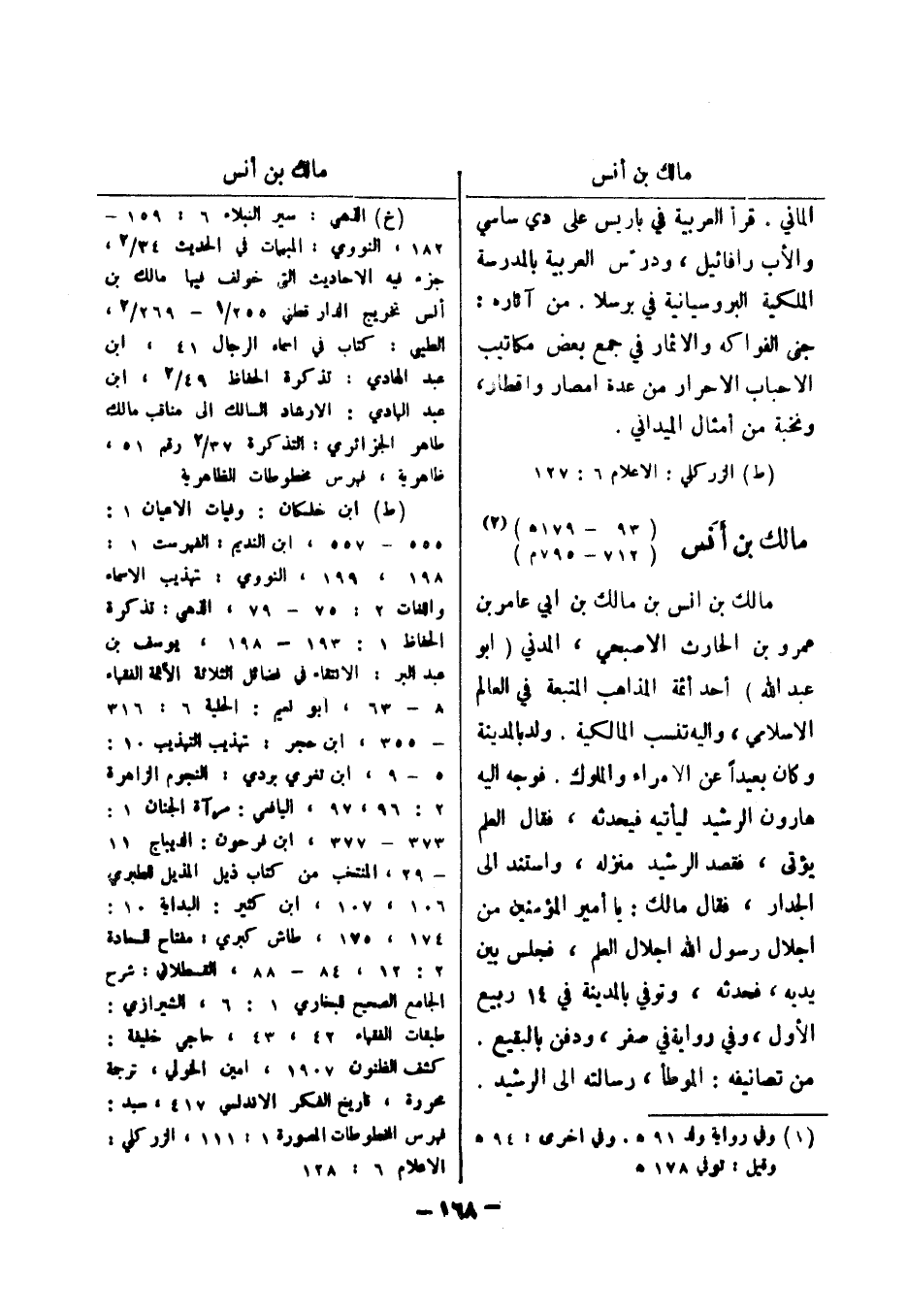 (ط) الزر كلي: الاعلام 6: 127 مالك بن أنس (93 - 179 هـ) (2) (712 - 795 م) مالك بن انس بن مالك بن ابي عامر بن عمرو بن الحارث الاصبحي، المدني (أبو عبد الله) أحد أئمة المذاهب المتبعة في العالم الاسلامي، واليه تنسب المالكية.