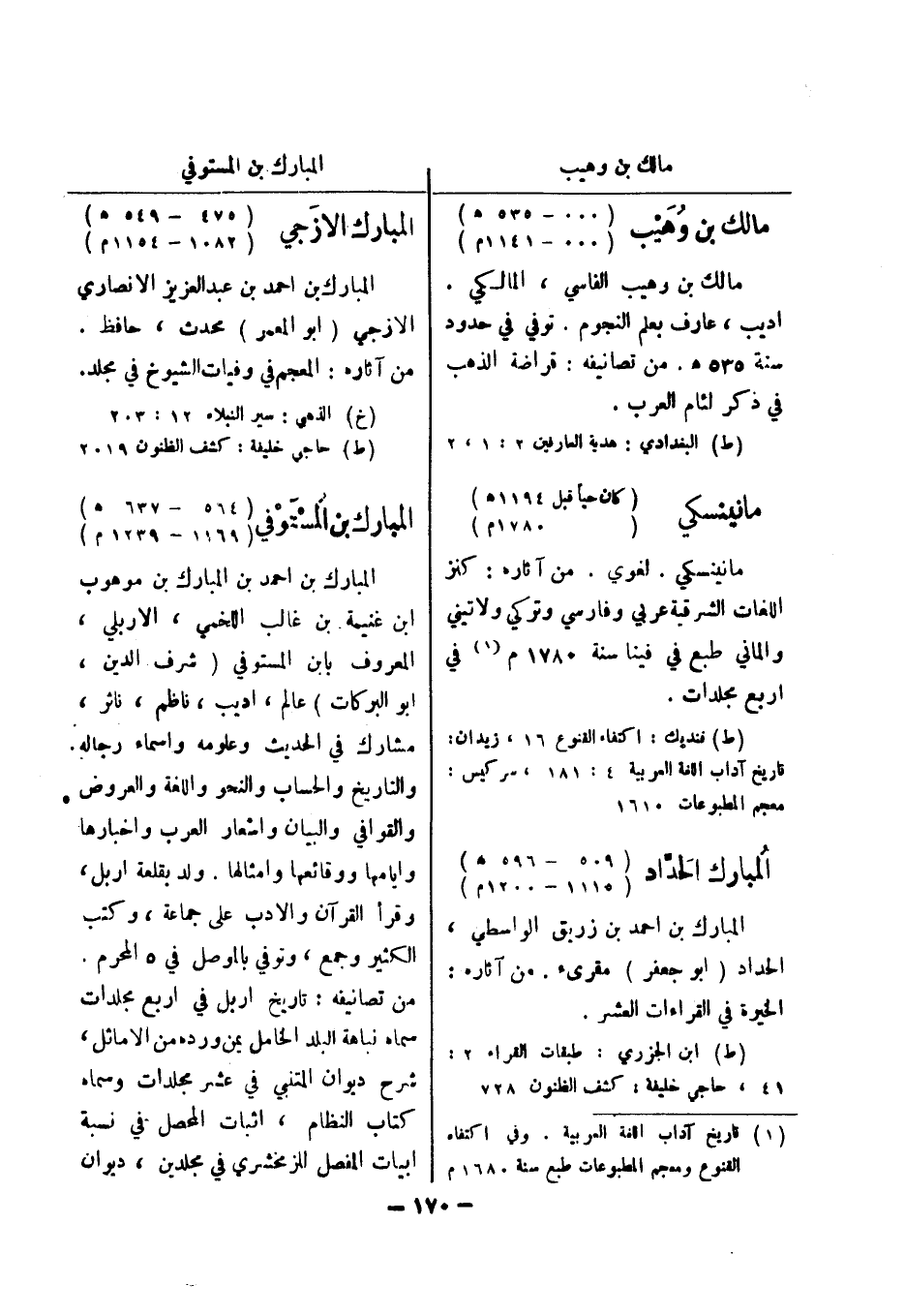 (خ) الذهبي: سير النبلاء 12: 203 (ط) حاجي خليفة: كشف الظنون 2019 المبارك بن المستوفي (564 - 637 هـ) (1169 - 1239 م) المبارك بن احمد بن المبارك بن موهوب ابن غنيمة بن غالب اللخمي، الاربلي، المعروف بابن المستوفي (شرف الدين، أبو البركات) عالم، اديب، ناظم، ناثر، مشارك في الحديث وعلومه واسماء رجاله.
