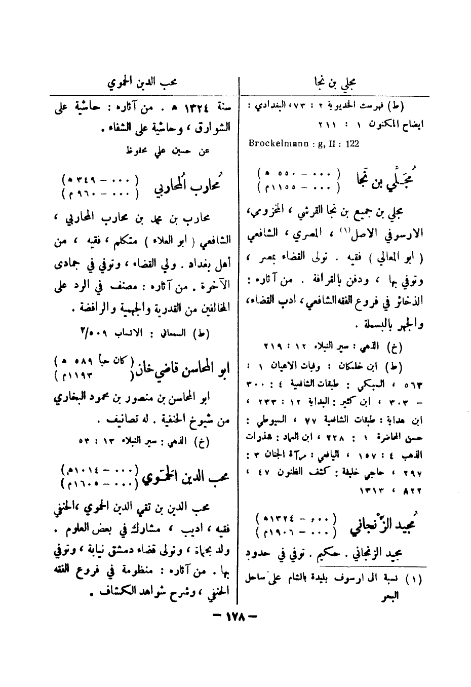 (ط) فهرست الخديوية 2: 73، البغدادي: ايضاح المكنون 1: 211 122: Brockelmann: g , II مجلي بن نجا (..- 550 هـ) (..- 1155 م) مجلي بن جميع بن نجا القرشي، المخزومي، الارسوفي الاصل (1) ، المصري، الشافعي (أبو المعالي) فقيه.