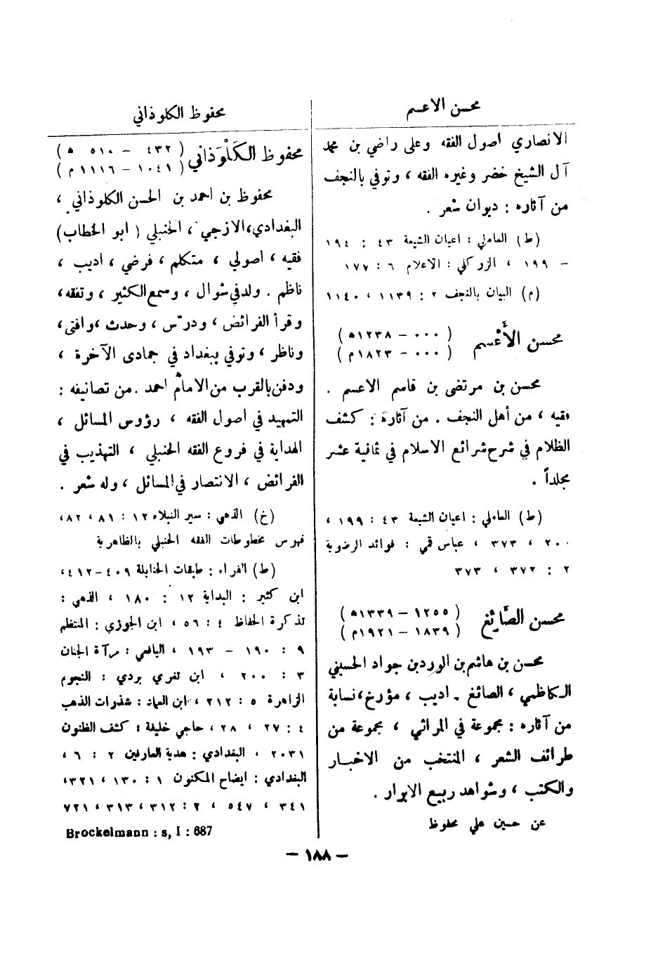 عن حسين علي محفوظ محفوظ الكلوذاني (432 - 510 هـ) (1041 - 1116 م) محفوظ بن احمد بن الحسن الكلوذاني، البغداه ددي، الازجي، الحنبلي (أبو الخطاب) فقيه، اصولي، متكلم، فرضي، اديب، ناظم.