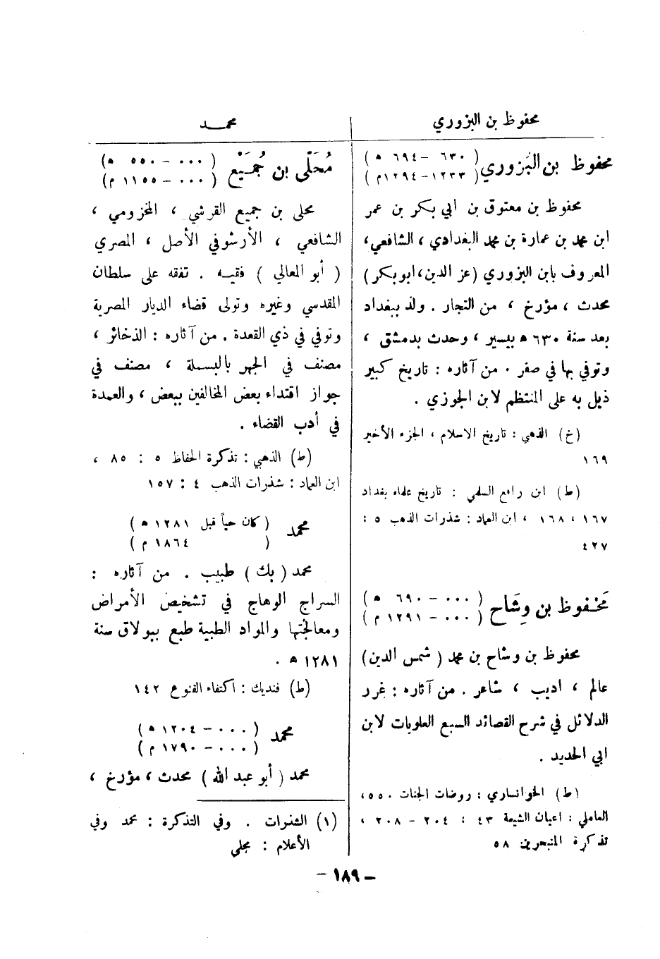 (ط) الخوانساري: روضات الجنات 550، العاملي: اعيان الشيعة 43: 204 - 208، تذكرة المتبحرين 58 محلى بن جميع (..- 550 هـ) (..- 1155 م) محلى بن جميع القرشي، المخزومي، الشافعي، الارشوفي الاصل، المصري
