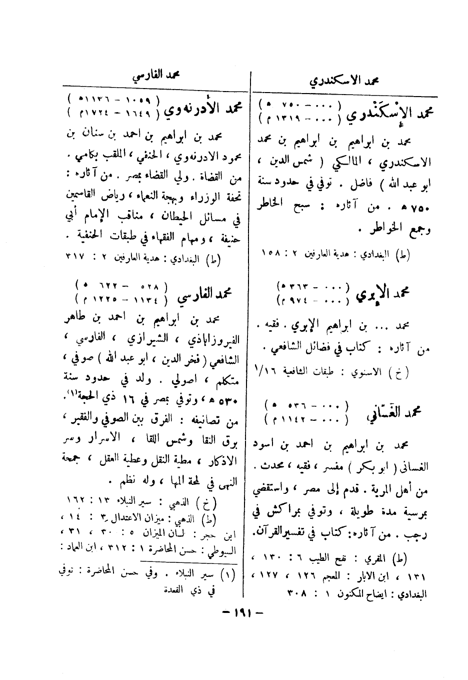(ط) البغدادي: هدية العارفين 2: 317 محمد الفارسي (528 - 622 هـ) (1134 - 1225 م) محمد بن ابراهيم بن احمد بن طاهر الفيروز اباذي، الشيرازي، الفارسي، الشافعي (فخر الدين، أبو عبد الله) صوفي،