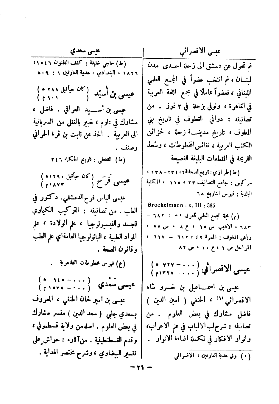 (1) وفي هدية العارفين: الاقسرائي (ط) حاجي خليفة: كشف الظنون 1546، 1826، البغدادي: هدية العارفين 1: 809 عيسى بن أسيد (كان حياقبل 288 هـ) (901 م) عيسى بن أسيد العراقي.