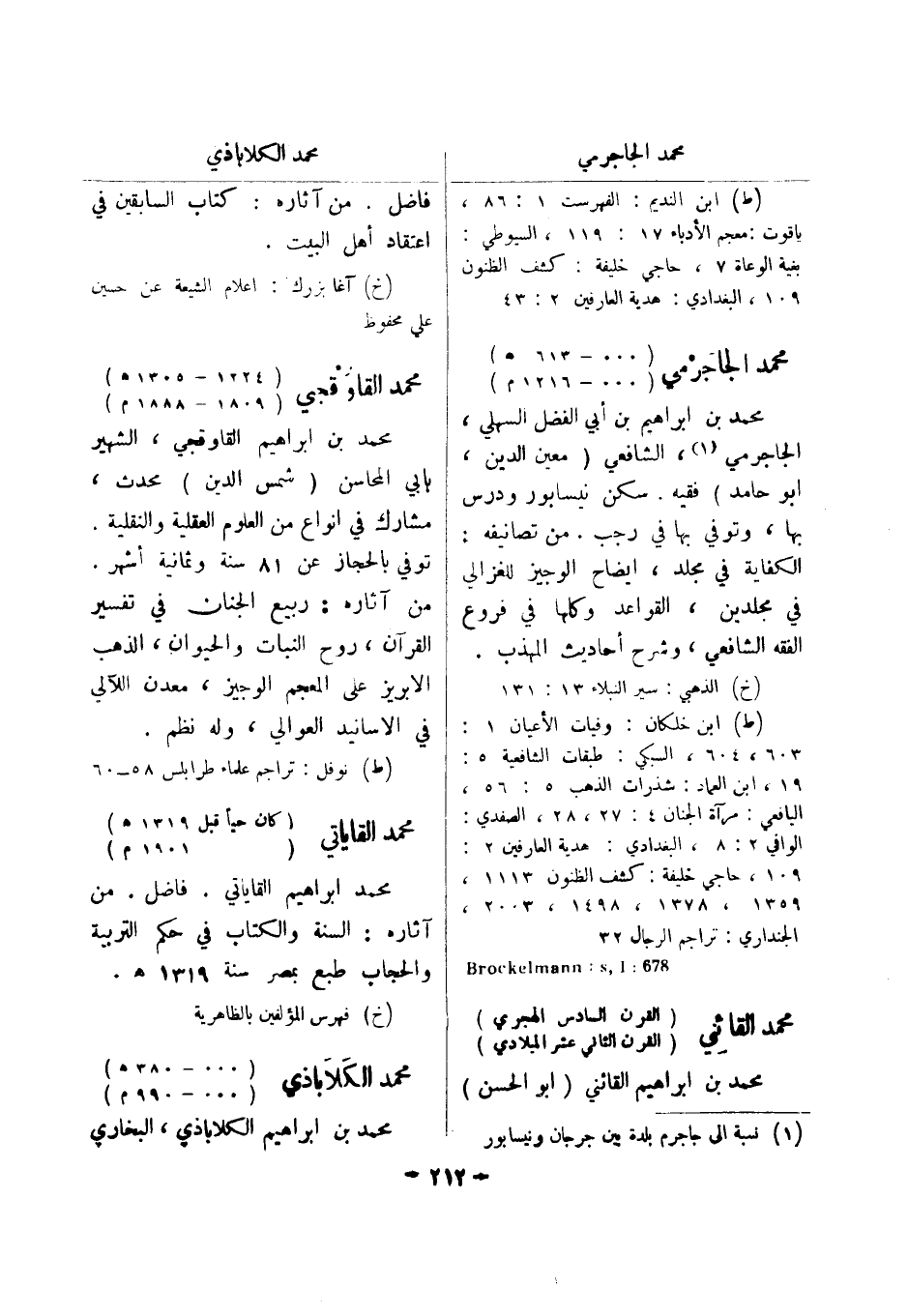 (ط) ابن النديم: الفهرست 1: 86، ياقوت: معجم الادباء 17: 119، السيوطي: بغية الوعاة 7، حاجي خليفة: كشف الظنون 109، البغدادي: هدية العارفين 2: 43 محمد الجاجرمي (..- 613 هـ) (..- 1216 هـ) محمد بن ابراهيم بن أبي الفضل السهلي، الجاجرمي (1) ، الشافعي (معين الدين، أبو حامد) فقيه.