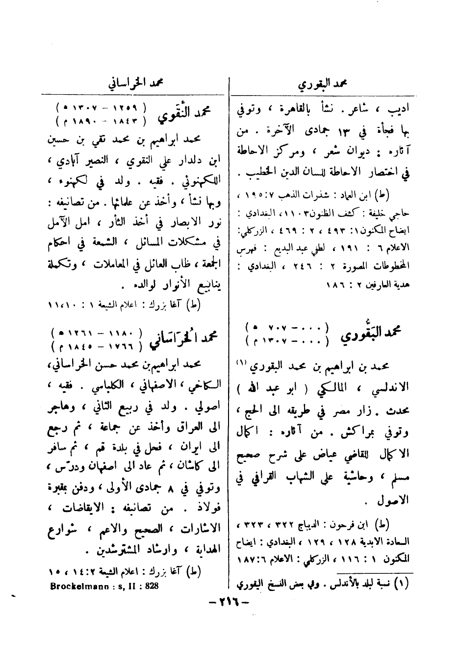 (ط) آغا بزرك: الاعلام الشيعة 1: 10، 11 محمد الخراساني (1180 - 1261 هـ) (1766 - 1845 م) محمد ابراهيم بن محمد حسن الخراساني، الكاخي، الاصفهاني، الكلباسي.