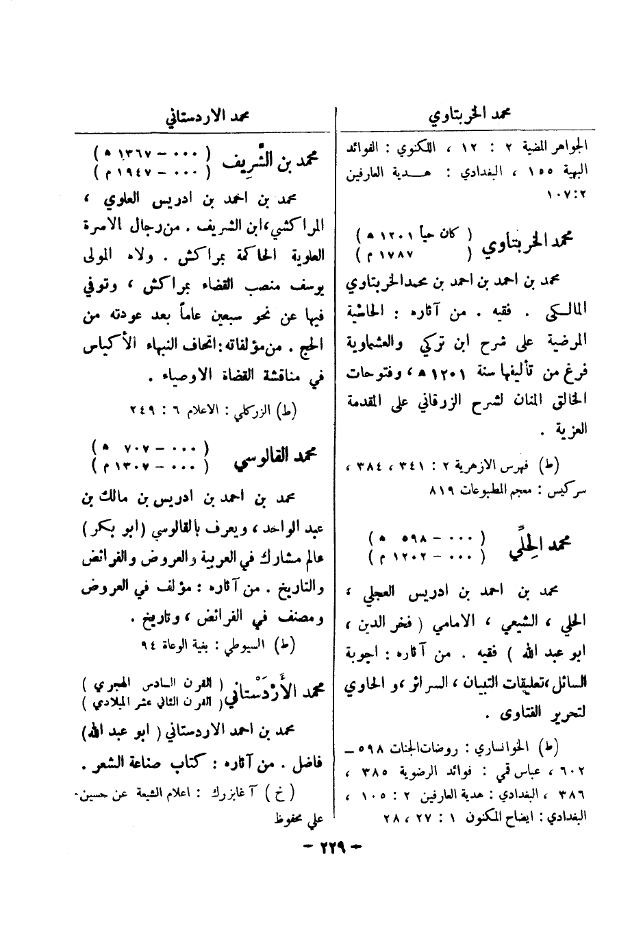 الجواهر المضية 2: 12، اللكنوي: الفوائد البهية 155، البغدادي: هدية العارفين 2: 107 محمد الخربتاوي (كان حيا 1201 هـ) (1787 م) محمد بن احمد بن احمد بن محمد الخربتاوي المالكى.