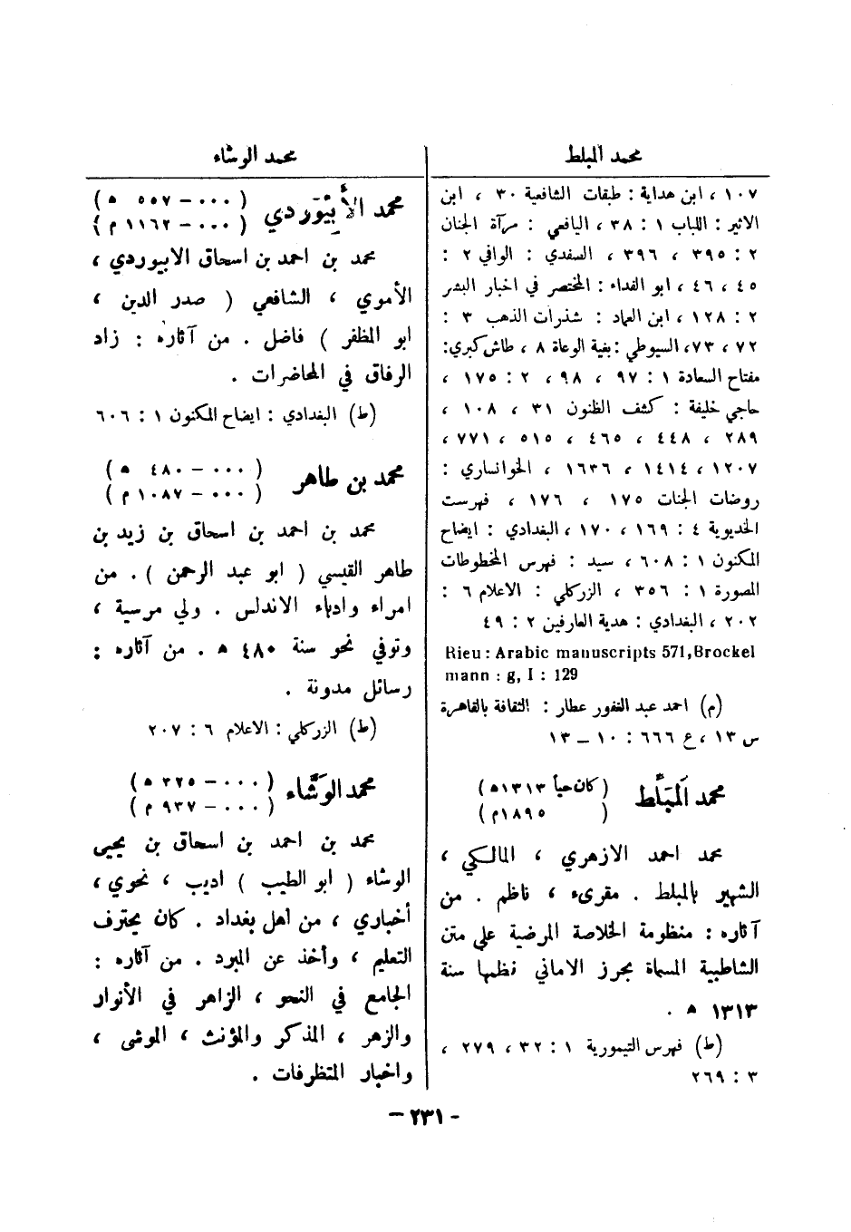 289، 448، 465، 515، 771، 1207، 1414، 1636، الخوانساري: روضات الجنات 175، 176، فهرست الخديوية 4: 169، 170، البغدادي: ايضاح المكنون 1: 608، سيد: فهرس المخطوطات المصورة 1: 356، الزر كلي: الاعلام 6: 202، البغدادي: هدية العارفين 2: 49 Rieu: Arabic manuscripts 175 , Brockel 129: mann: g , I (م) احمد عبد الغفور عطار: الثقافة بالقاهرة س 13، ع 666: 10 - 13 محمد المبلط (كان حيا 1313 هـ) (1895 م) محمد احمد الازهري، المالكي، الشهير بالمبلط.