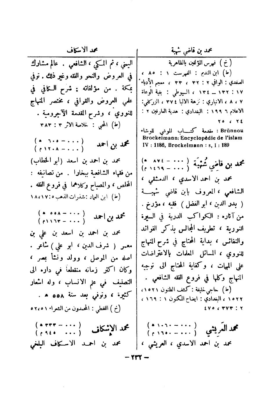 (خ) فهرس المؤلفين بالظاهرية (ط) ابن النديم: الفهرست 1: 85، الصفدي: الوافي 2: 32، 33، معجم الادباء 17: 132 - 134، السيوطي: بغية الوعاة 7، 8، الانباري: نزهة الالبا 374، الزر كلي: الاعلام 199 6: البغدادي: هدية العارفين 2: 24، 25: Brunnou مقدمة كتاب الموشي للوشاء Brockelmann: Encyclopedie de l ' islam 189: IV: 6811 , Brockelmann: s , I محمد بن قاضي شهبة (..- 874 هـ) (..- 1469 م) محمد بن احمد الاسدي، الدمشقي، الشافعي، المعروف بابن قاضي شهبة (بدر الدين، أبو الفضل) فقيه، مؤرخ.