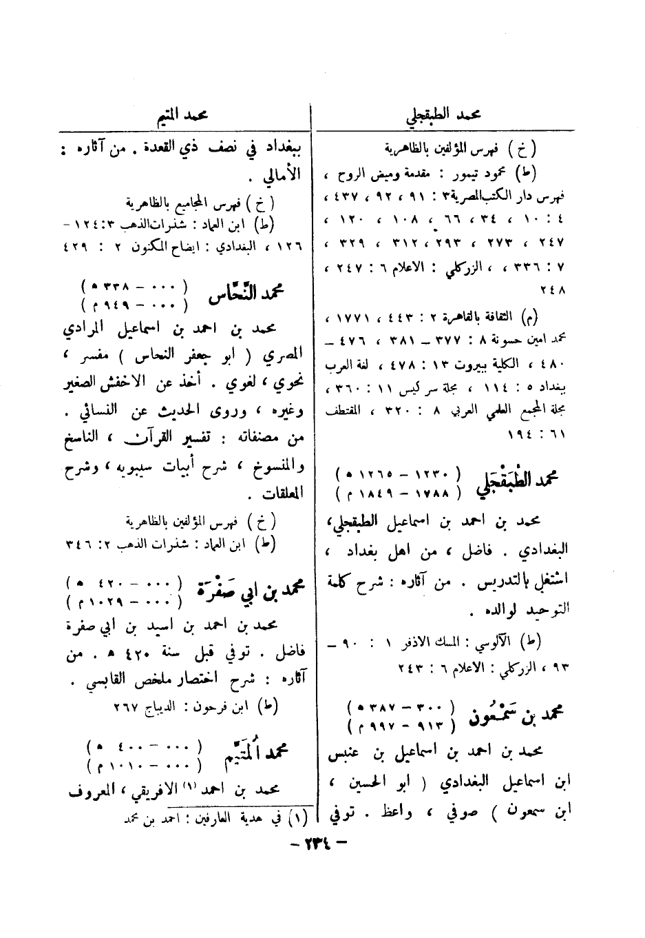 126، البغدادي: ايضاح المكنون 2: 429 محمد النحاس (..- 338 هـ) (..- 949 م) محمد بن احمد بن اسماعيل المرادي المصري (أبو جعفر النحاس) مفسر، نحوي، لغوي.