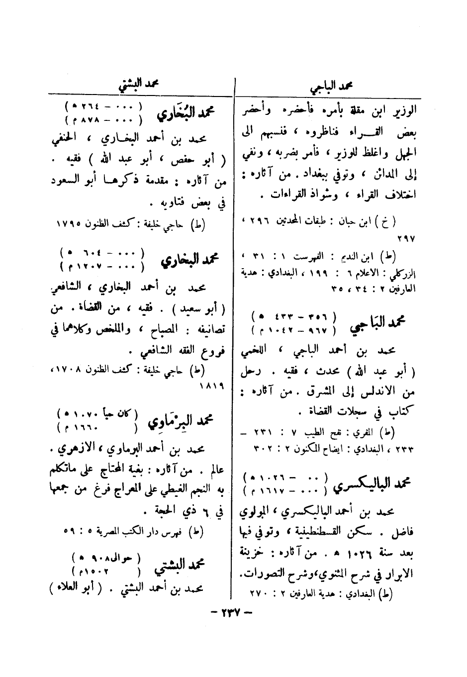 (ط) ابن النديم: الفهرست 1: 31، الزركلي: الاعلام 6: 199، البغدادي: هدية العارفين 2: 34، 35 محمد الباجي (356 - 433 هـ) (967 - 1042 م) محمد بن أحمد الباجي، اللخمي (أبو عبد الله) محدث، فقيه.