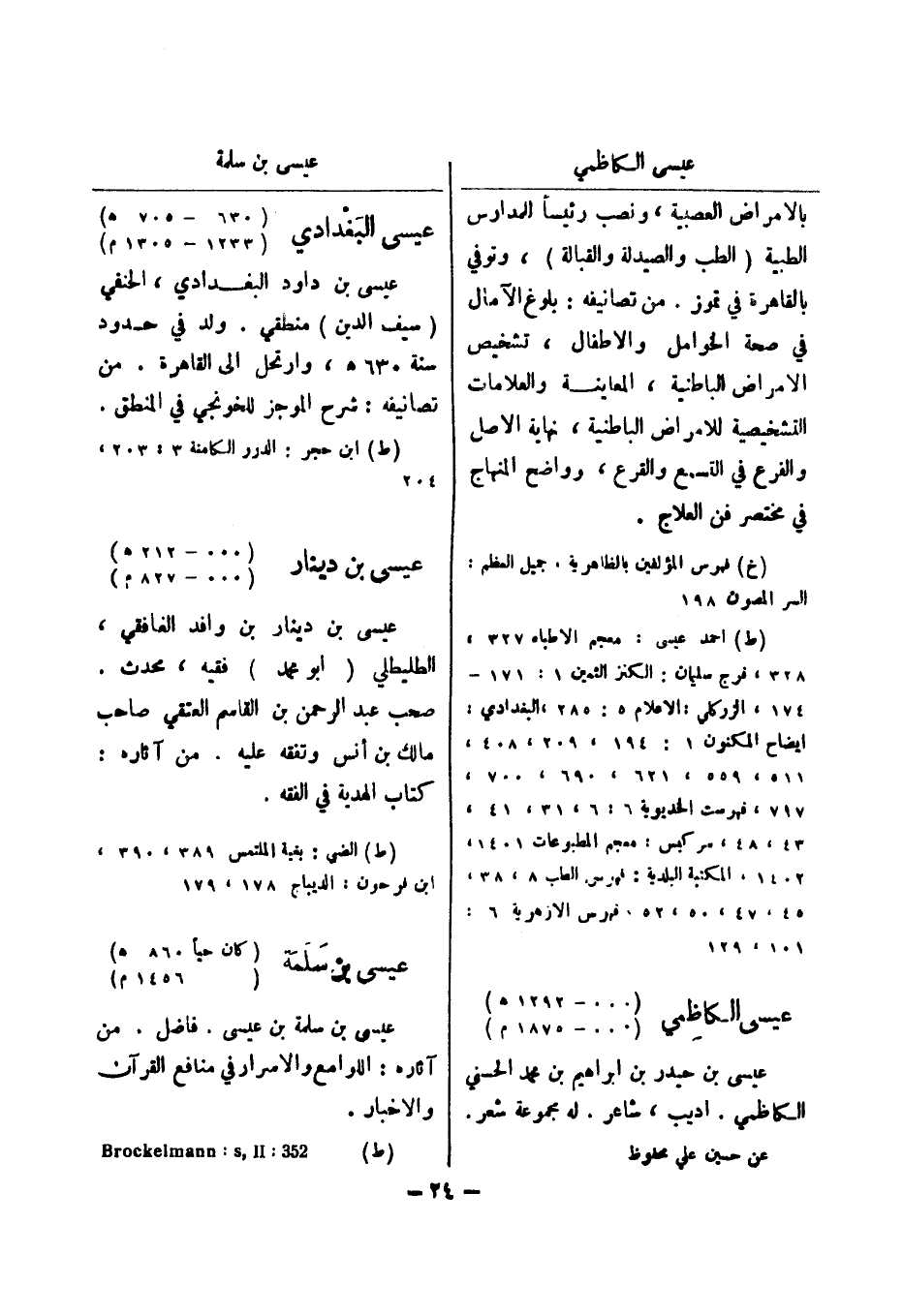 (خ) فهرس المؤلفين بالظاهرية، جميل العظم: السر المصون 198 (ط) احمد عيسى: معجم الاطباء 327، 328، فرج سليمان: الكنز الثمين 1: 171 - 174، الزر كلي: اعلام 5: 285، البغدادي: ايضاح المكنون 1: 194، 209، 408، 511، 559، 621، 690، 700، 717، فهرست الخديوية 6: 6، 31، 41، 43، 48، سركيس: معجم المطبوعات 1401، 1402، المكتبة البلدية: فهرس الطب 8، 38، 45، 47، 50، 52، فهرس الازهرية 6: 101، 129 عيسى الكاظمي (..- 1292 هـ) (..- 1875 م)