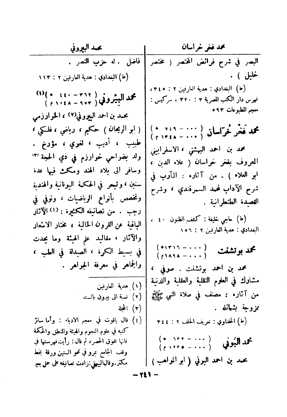 (ط) البغدادي: هدية العارفين 2: 113 محمد البيروني (362 - 440 هـ) (1) (973 - 1048 م) محمد بن احمد البيروني (2) ، الخوارزمي (أبو الريحان) حكيم، رياضي، فلكي، طبيب، أديب، لغوي، مؤرخ.