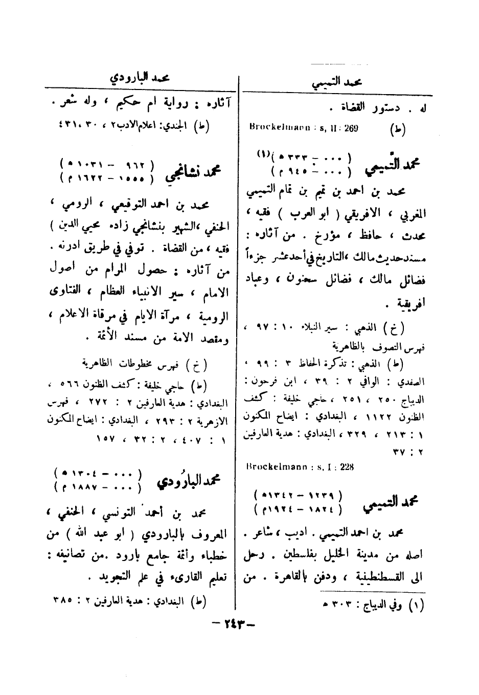 (خ) الذهبي: سير النبلاء 10: 97، فهرس التصوف بالظاهرية (ط) الذهبي: تذكرة الحفاظ 3: 99، الصفدي: الوافي 2: 39، ابن فرحون: الديباج 250، 251، حاجي خليفة: كشف الظنون 1122، البغدادي: ايضاح المكنون 1: 213، 329، البغدادي: هدية العارفين 2: 37 228: Brockelmann: s , I محمد التميمي (1239 - 1342 هـ) (1824 - 1924 م) محمد بن احمد التميمي.