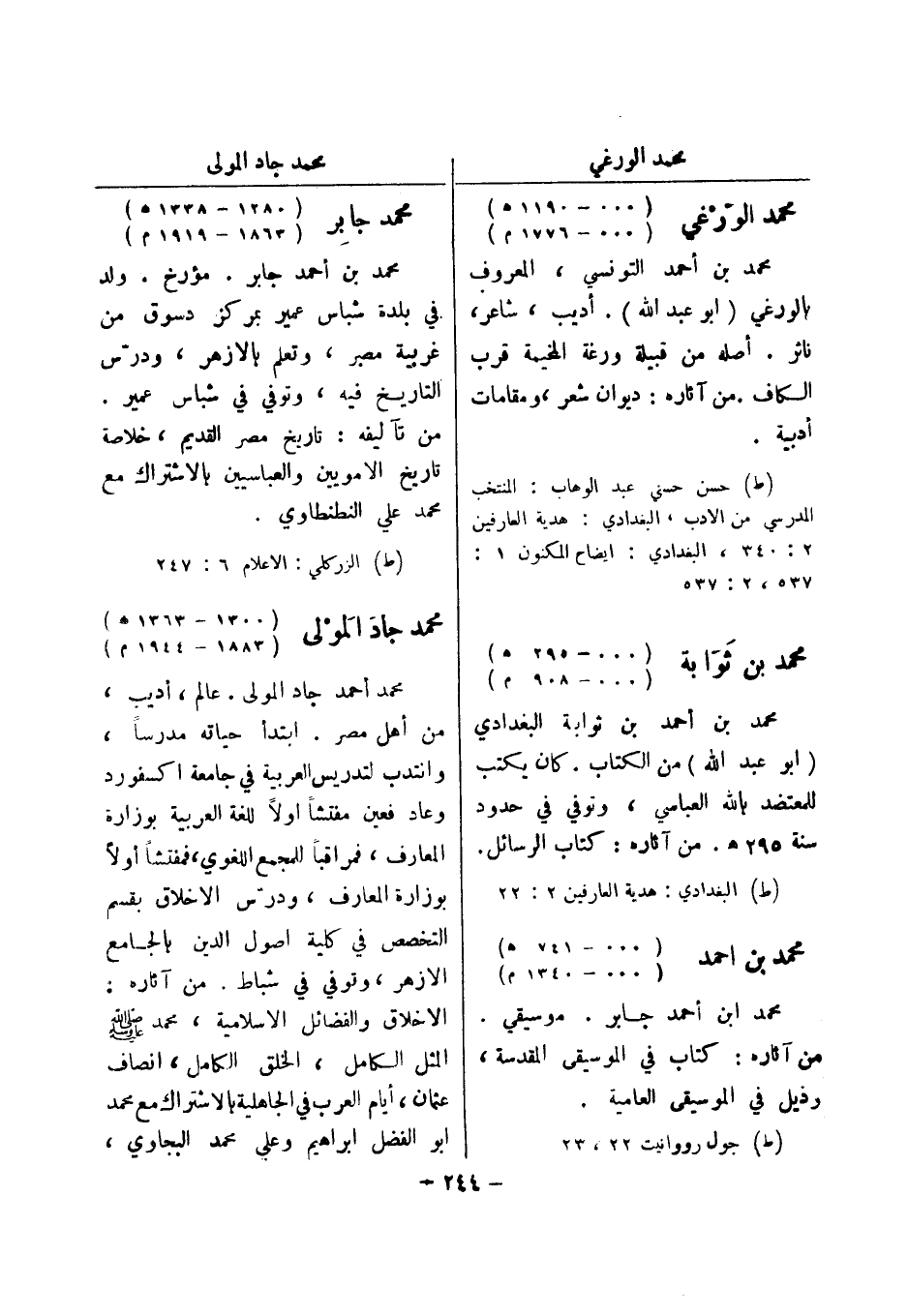 (ط) الزر كلي: الاعلام 6: 247 محمد جاد المولى (1300 - 1363 هـ) (1883 - 1944 م) محمد أحمد جاد المولى.