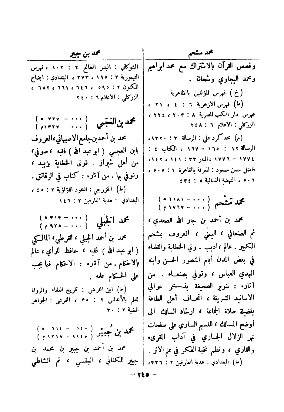 (خ) فهرس المؤلفين بالظاهرية (ط) فهرس الازهرية 6: 4، 21، فهرس دار الكتب المصرية 8: 203، 224، الزر كلي: الاعلام 6: 248 (م) محمد كرد علي: الرسالة 3: 1320، الرسالة 12: 165 - 167، الكتاب 4: 1774 - 1776، المنار 33: 141، 142، فاضل حسن مسعود: المعرفة بالقاهرة 1: 505، 506، النهضة النسائية 8: 434 محمد مشحم (..- 1181 هـ) (..- 1767 م) محمد بن أحمد بن جابر الله الصعدي، ثم الصنعائي، اليمني، المعروف بمشحم الكبير.