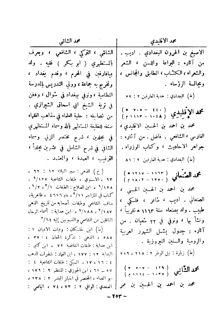 (ط) زبارة: نيل الوطر 2: 218، 219 محمد الشاشي (429 - 507 هـ) (1037 - 1114 م) محمد بن احمد بن الحسين بن عمر الشاشي، التركي، الشافعي، ويعرف بالمستظهري (أبو بكر) فقيه.