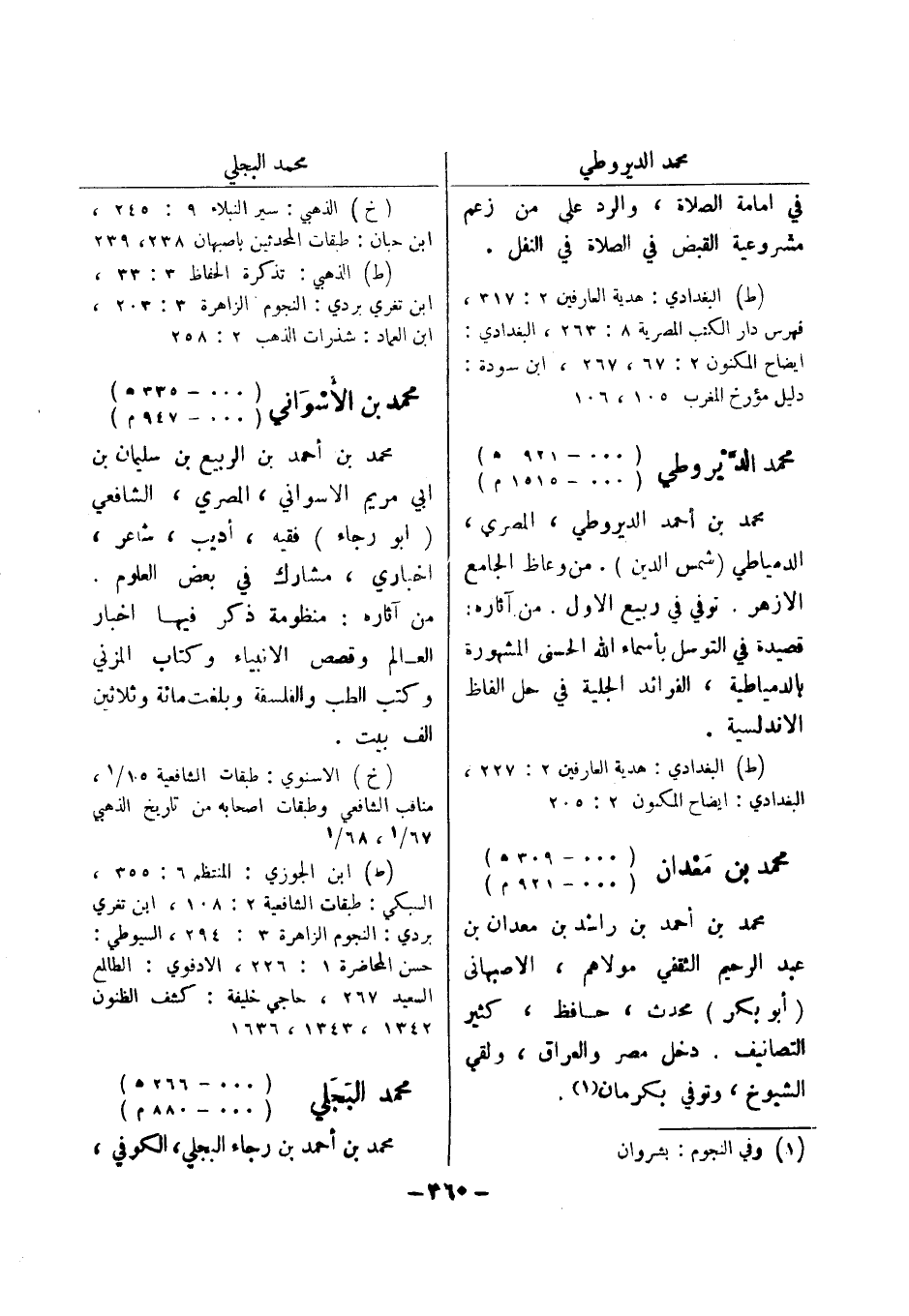 (ط) البغدادي: هدية العارفين 2: 317، فهرس دار الكتب المصرية 8: 263، البغدادي: ايضاح المكنون 2: 67، 267، ابن سودة: دليل مؤرخ المغرب 105، 106 محمد الديروطي (..- 921 هـ) (..- 1515 م) محمد بن أحمد الديروطي، المصري، الدمياطي (شمس الدين) .