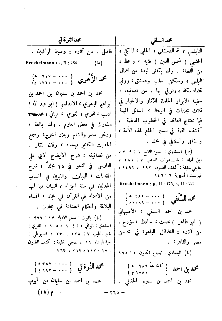 (ط) السخاوي: الضوء اللامع 6: 309، ابن العماد: شذرات الذهب 7: 286، حاجي خليفة: كشف الظنون 992، 1492، فهرست الخديوية 6: 149 224: Brockelmann: g , II: 571 , s , II محمد السلفي (..- 482 هـ) (..- 1089 م) محمد بن احمد السلفي، الاصبهاني (أبو طاهر) محدث، حافظ، مؤرخ.