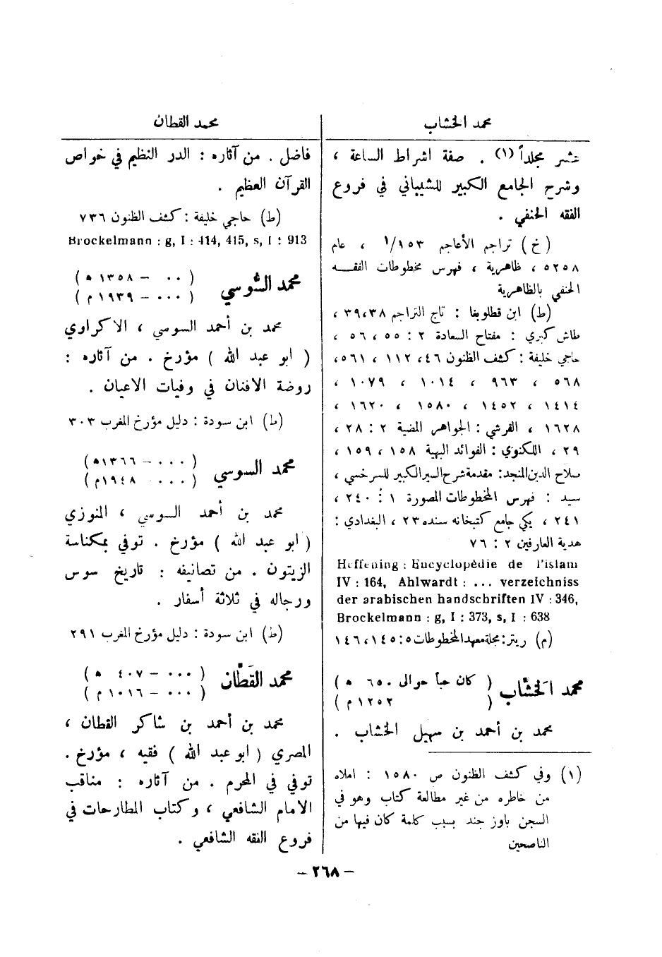 (ط) حاجي خليفة: كشف الظنون 736 913: Brockelmann: g , I: 414 , 514 , s , I محمد السوسي (..- 1358 هـ) (..- 1939 م) محمد بن أحمد السوسي، الاكراوي (أبو عبد الله) مؤرخ.