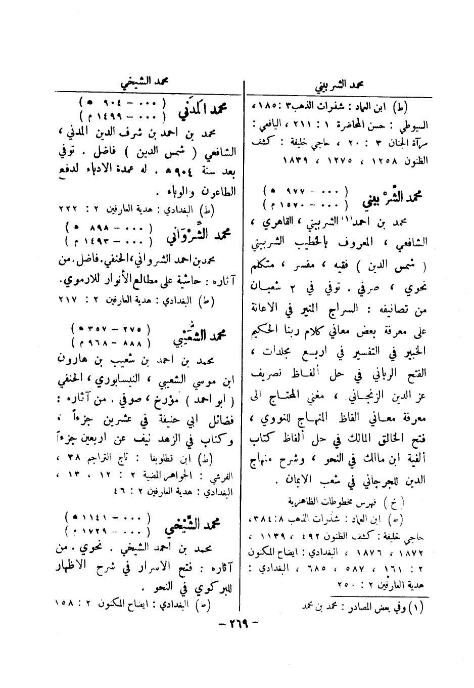 (ط) ابن العماد: شذرات الذهب 3: 185، السيوطي: حسن المحاضرة 1: 211، اليافعي: مرآة الجنان 3: 20، حاجي خليفة: كشف الظنون 1258، 1275، 1839 محمد الشربيني (..- 977 هـ) (..- 1570 م) محمد بن احمد (1) الشربيني، القاهري، الشافعي، المعروف بالخطيب الشربيني (شمس الدين) فقيه، مفسر، متكلم نحوي، صرفي.