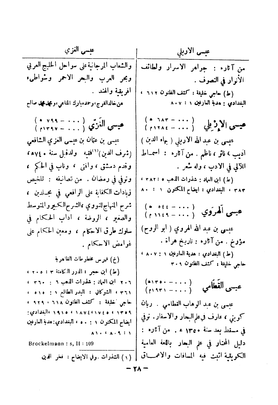(ط) حاجي خليفة: كشف الظنون 612، البغدادي: هدية العارفين 1: 807 عيسى الاربلي (..- 683 هـ) (..- 1284 م) عيسى بن عبد الله الاربلي (بهاء الدين) اديب، ناثر، ناظم.
