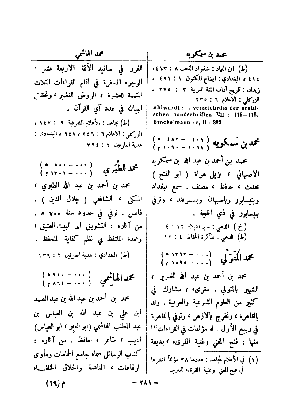 (خ) الذهبي: سير النبلاء 12: 4 (ط) الذهبي: تذكرة الحفاظ 4: 12 محمد المتولي (..- 1313 هـ) (..- 1895 م) محمد بن أحمد بن عبد الله الضرير، الشهير بالمتولي.