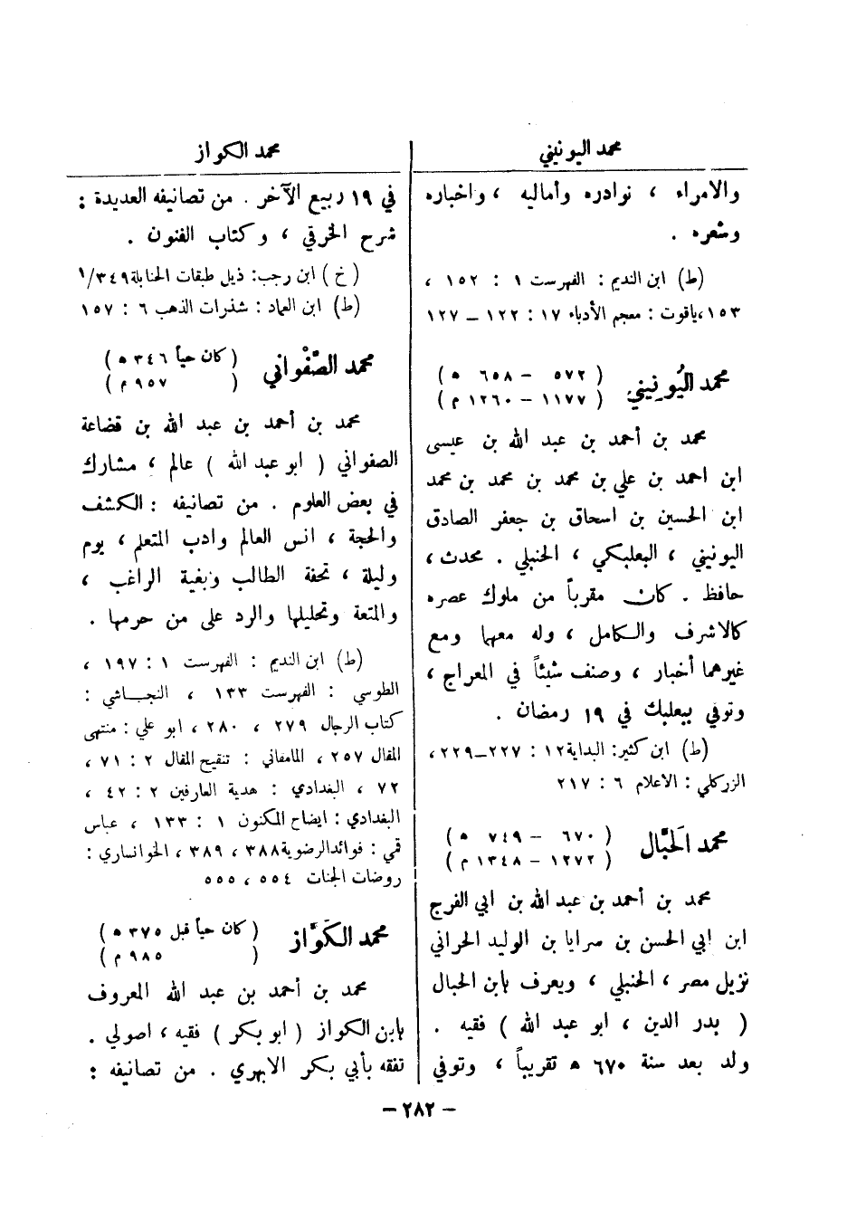 (ط) ابن النديم: الفهرست 1: 152، 153، ياقوت: معجم الادباء 17: 122 - 127، محمد اليونيني (572 - 658 هـ) (1177 - 1260 م) محمد بن أحمد بن عبد الله بن عيسى ابن احمد بن علي بن محمد بن محمد بن محمد ابن الحسين بن اسحاق بن جعفر الصادق اليونيني، البعلبكي، الحنبلي.