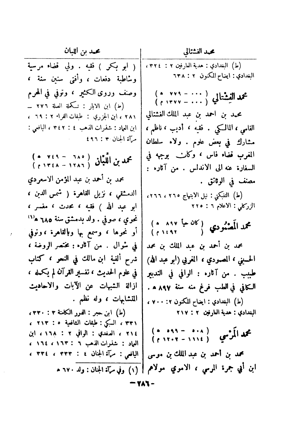 ولي قضاء مرسية وشاطبة دفعات، وأفتى ستين سنة، وصنف وروى الكثير، وتوفي في المحرم (ط) ابن الابار: تكملة الصلة 276 - 281، ابن الجرزي: طبقات القراء 2: 69، ابن العماد: شذرات الذهب 4: 342، اليافعي: مرآة الجنان 3: 496 محمد بن اللبان (685 - 749 هـ) (1286 - 1348 م) محمد بن أحمد بن عبد المؤمن الاسعردي الدمشقي، نزيل القاهرة (شمس الدين، أبو عبد الله) فقيه، محدث، مفسر، نحوي، صوفي.
