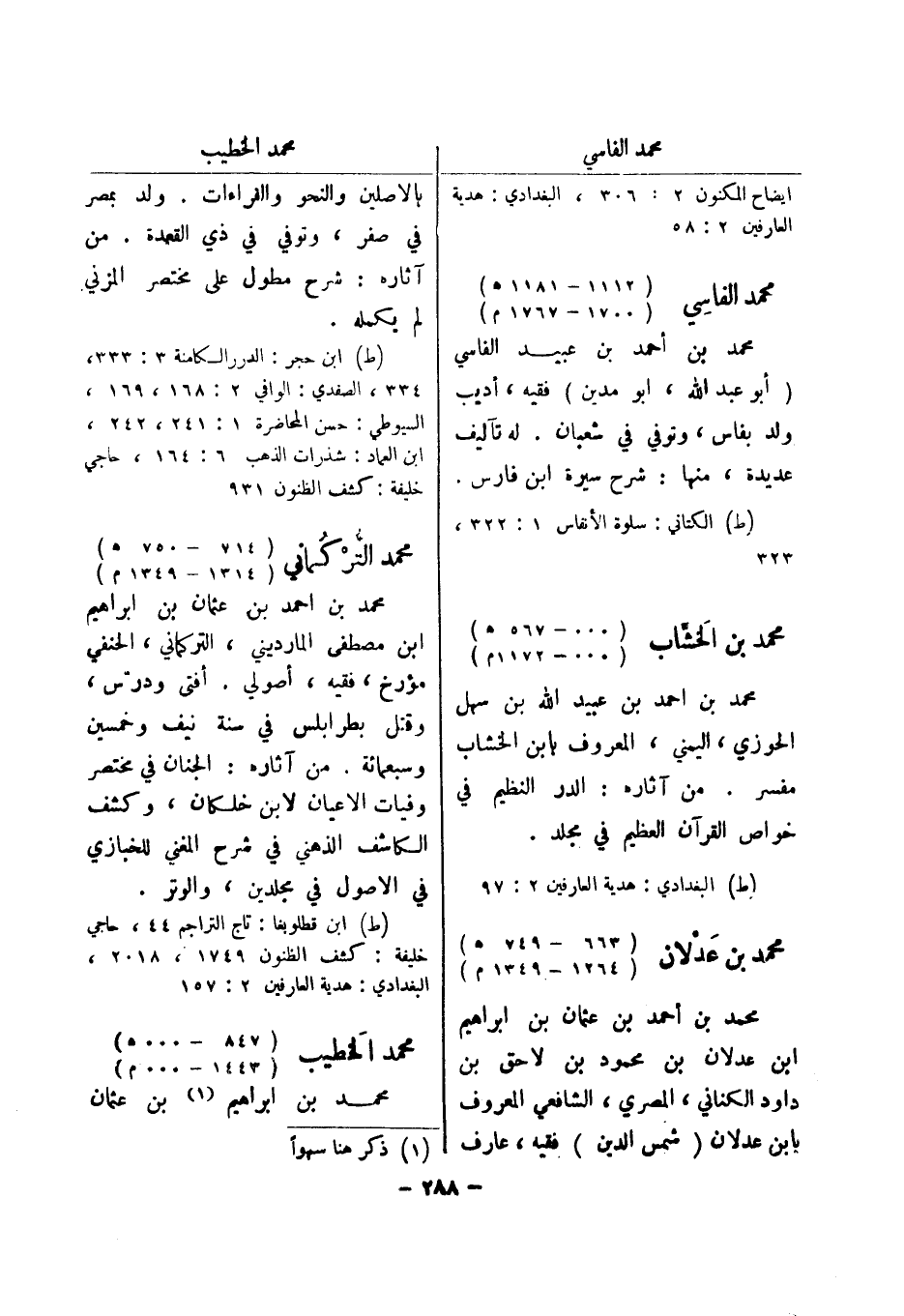 (ط) ابن قطلوبغا: تاج التراجم 44، حاجي خليفة: كشف الظنون 1749، 2018، البغدادي: هدية العارفين 2: 157 محمد الخطيب (847 -..هـ) (1443 -..م) محمد بن ابراهيم (1) بن عثمان
