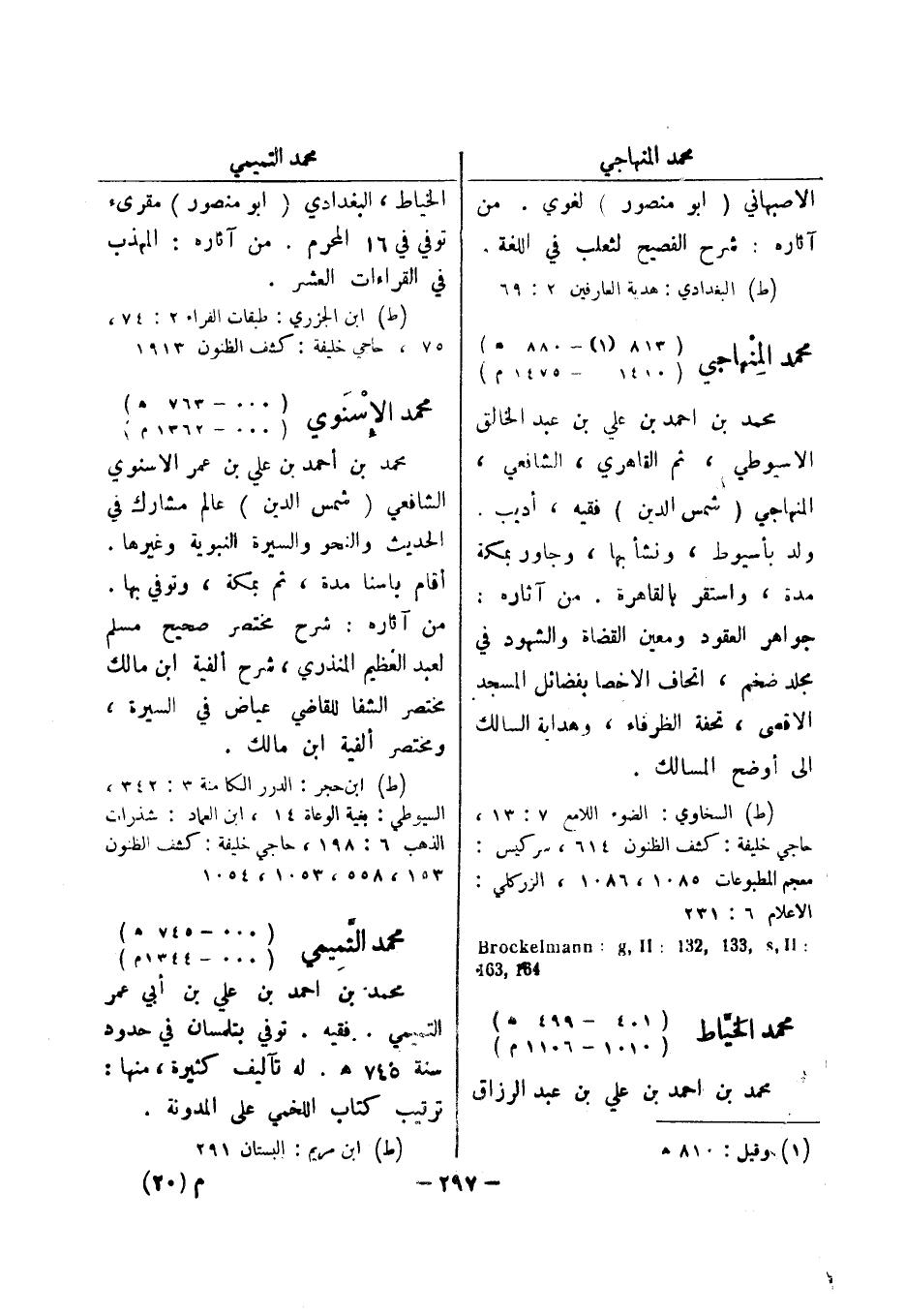 (ط) البغدادي: هدية العارفين 2: 69 محمد المنهاجي (813 (1) - 880 هـ) (1410 - 1475 م) محمد بن احمد بن علي بن عبد الخالق الاسيوطي، ثم القاهري، الشافعي، المنهاجي (شمس الدين) فقيه، أديب.