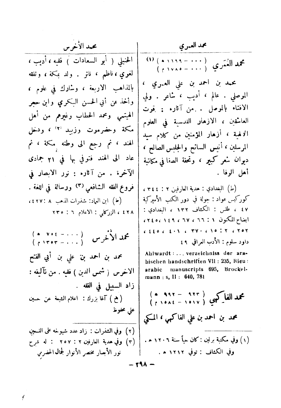 47، طلس: الكشاف 132، البغدادي: ايضاح المكنون 1: 66، 67، 149، 245، 252، 2: 15، 370، 401، 445، داود سلوم: الادب العراقي 49 - Ahlwardt:..verzeichniss der ara: bischen handschriften VII: 532 , Rieu - arabic manuscripts 596 , Brockel 781 , 640: mann: s , II محمد الفاكهي (923 - 992 هـ) (1517 - 1584 م) محمد بن احمد بن علي الفاكهي، المكي