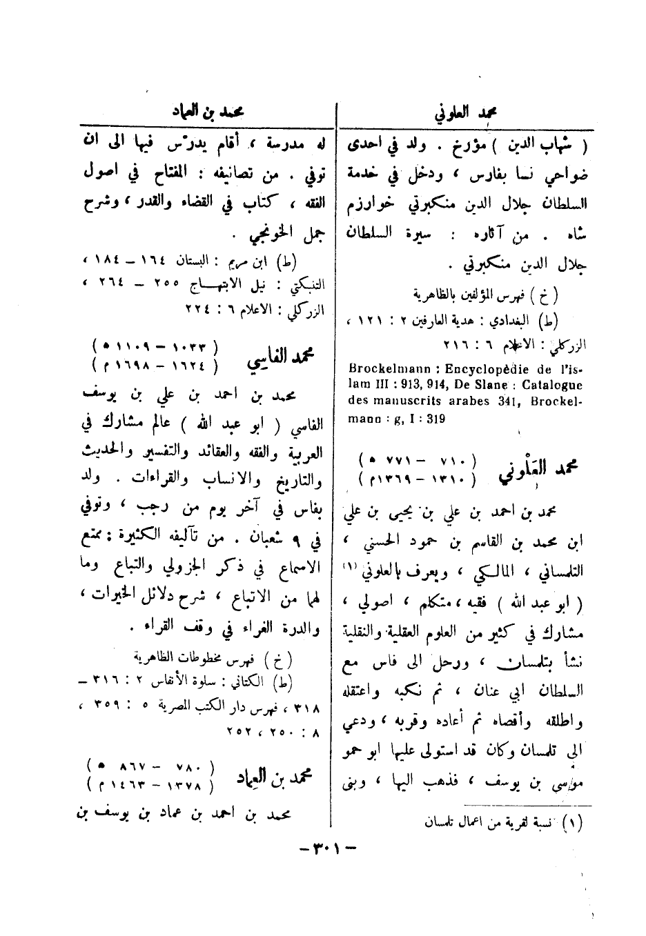 318، فهرس دار الكتب المصرية 5: 359، 8: 250، 252 محمد بن العماد (780 - 867 هـ) (1378 - 1463 م) محمد بن احمد بن عماد بن يوسف بن